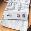 Printed wood, raw brass with stainless steel post, nickel and lead free.