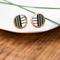 This small sized earring style features laser cut wood pressed into a brass cabochon with stainless steel posts. All earring posts are lead, nickel, and cadmium free. The wood has been sealed with multiple layers of high grade spray varnish to protect it from the elements.